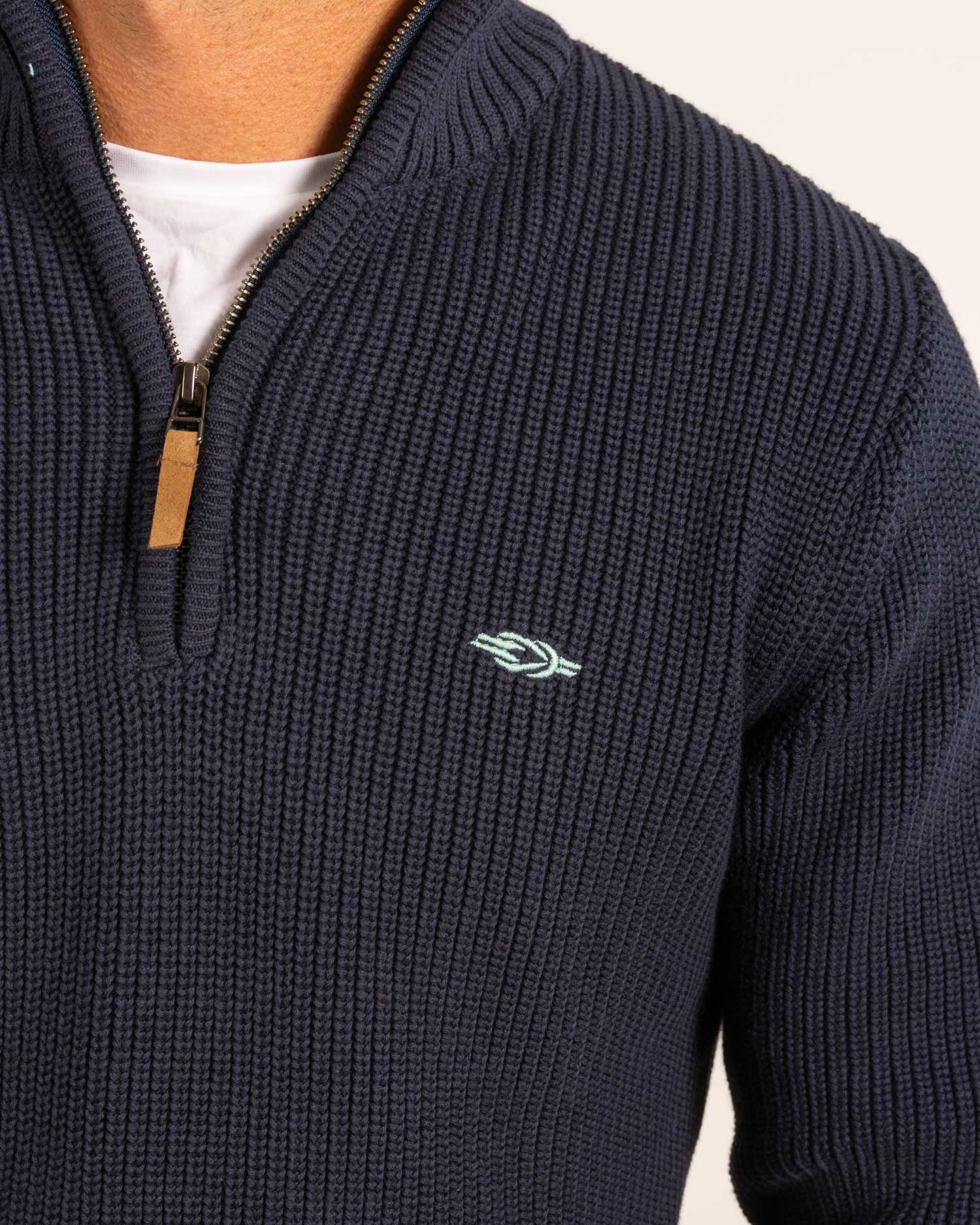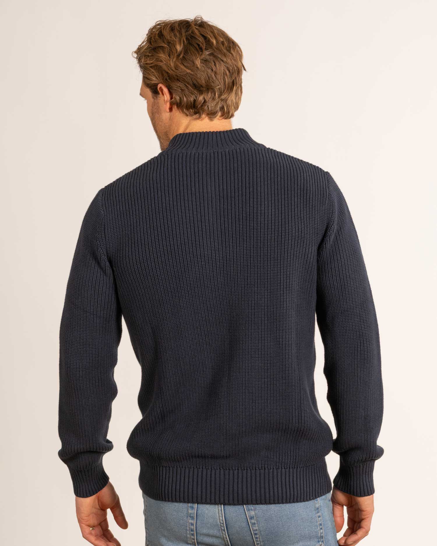 Elevate your cold-weather wardrobe with our Burford chunky knit half zip in Navy. Crafted from a luxuriously soft blend cotton, this thick knitted piece offers warmth and comfort. Featuring a classic ribbed cuffs and hem, the a classic understated piece that has snugness at it's core.