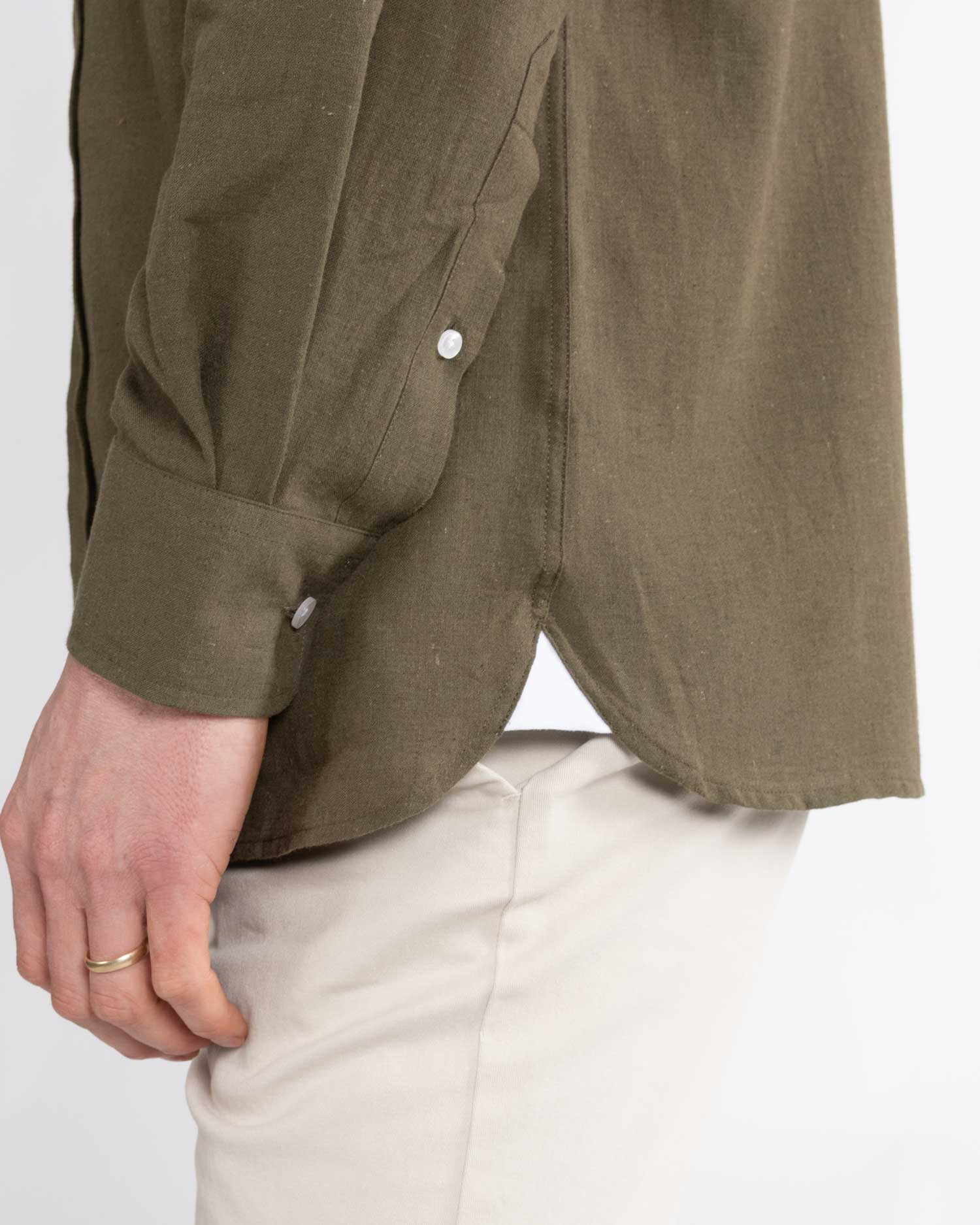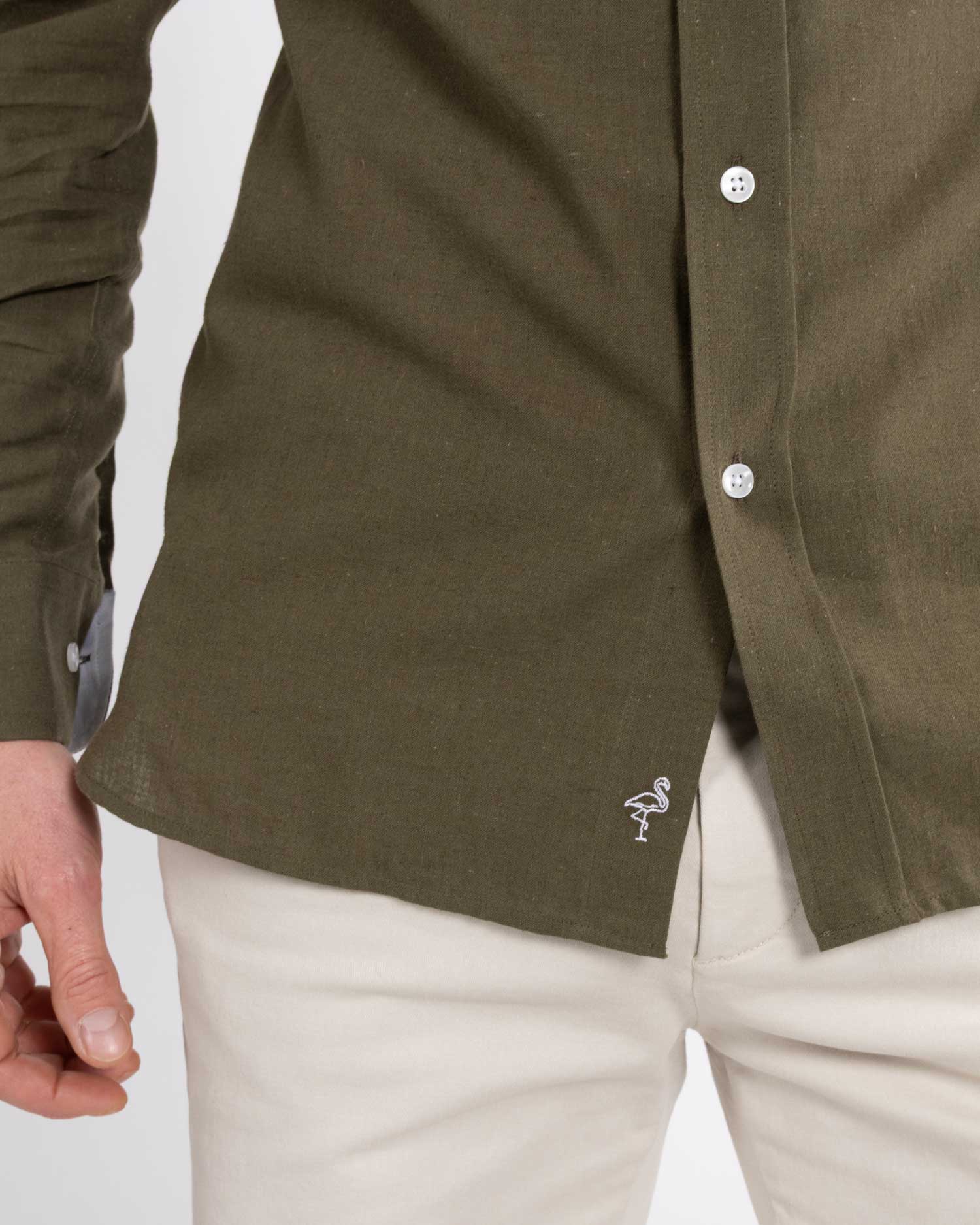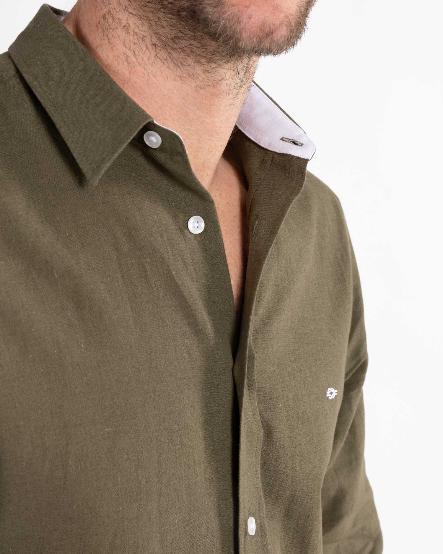 Khaki Green linen shirt by Reef Knots.