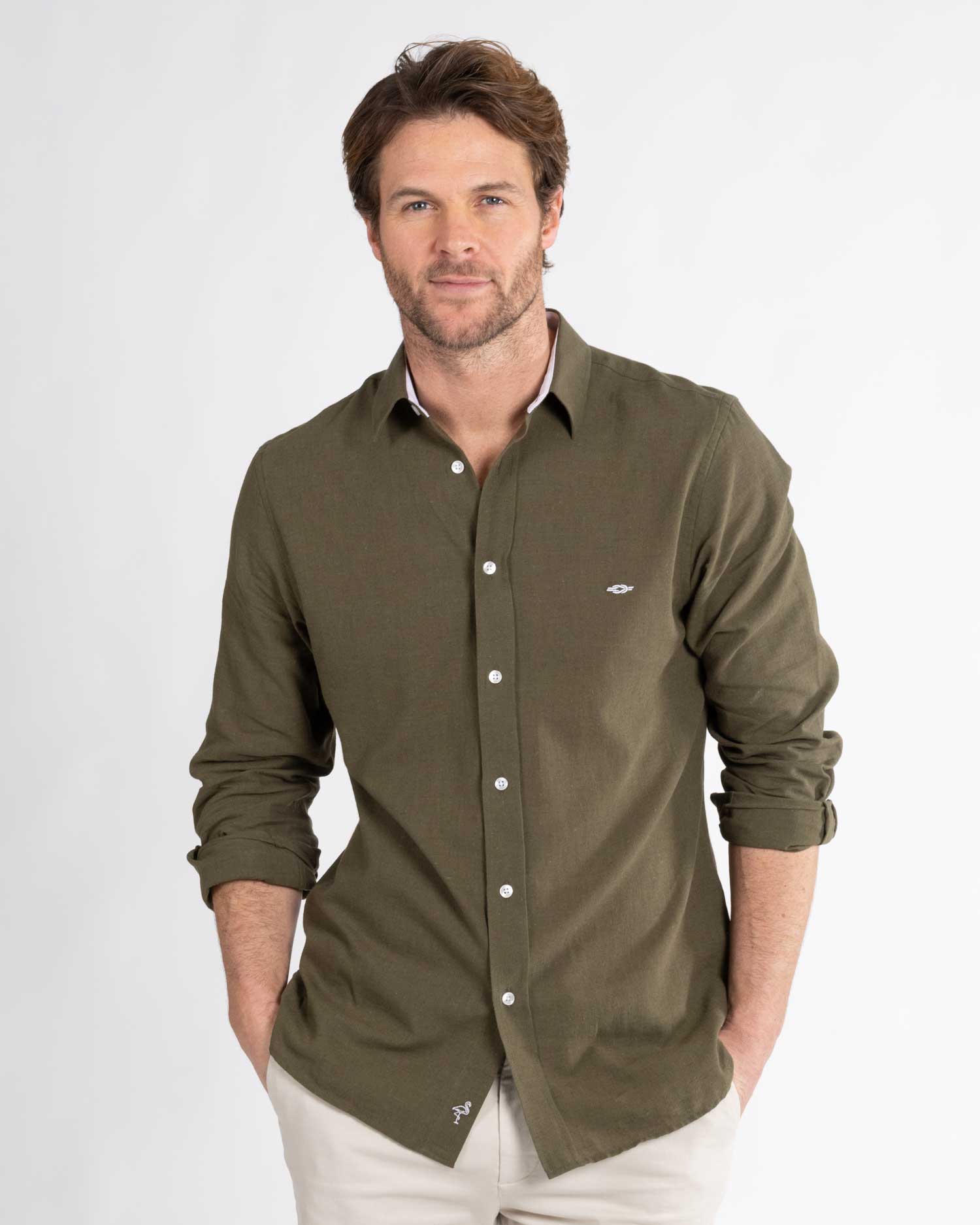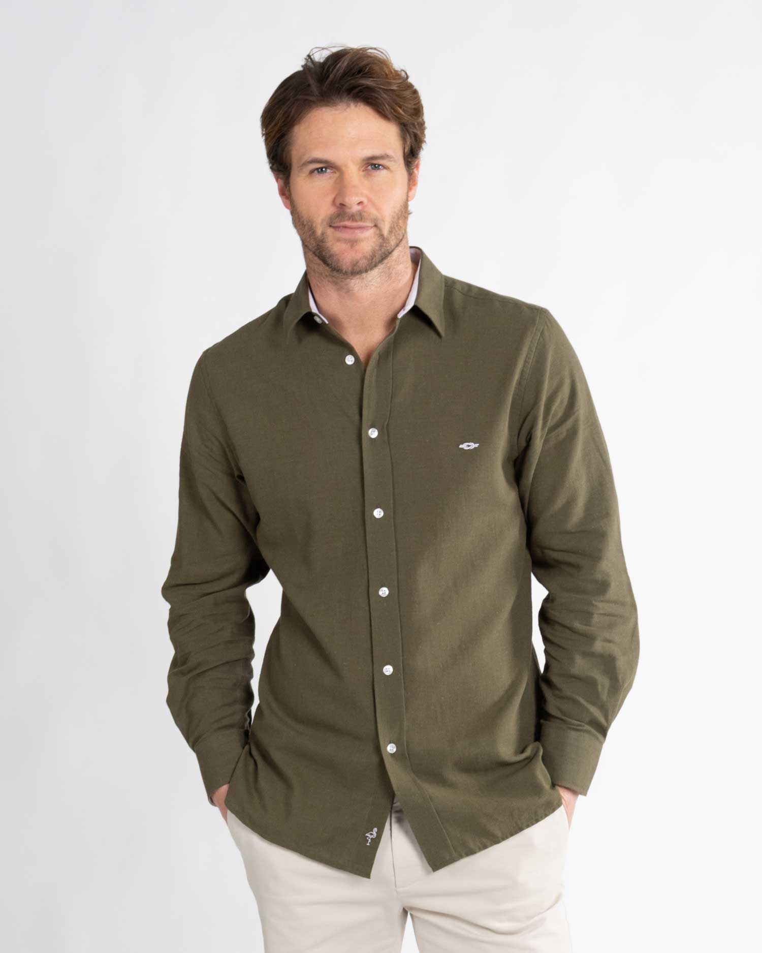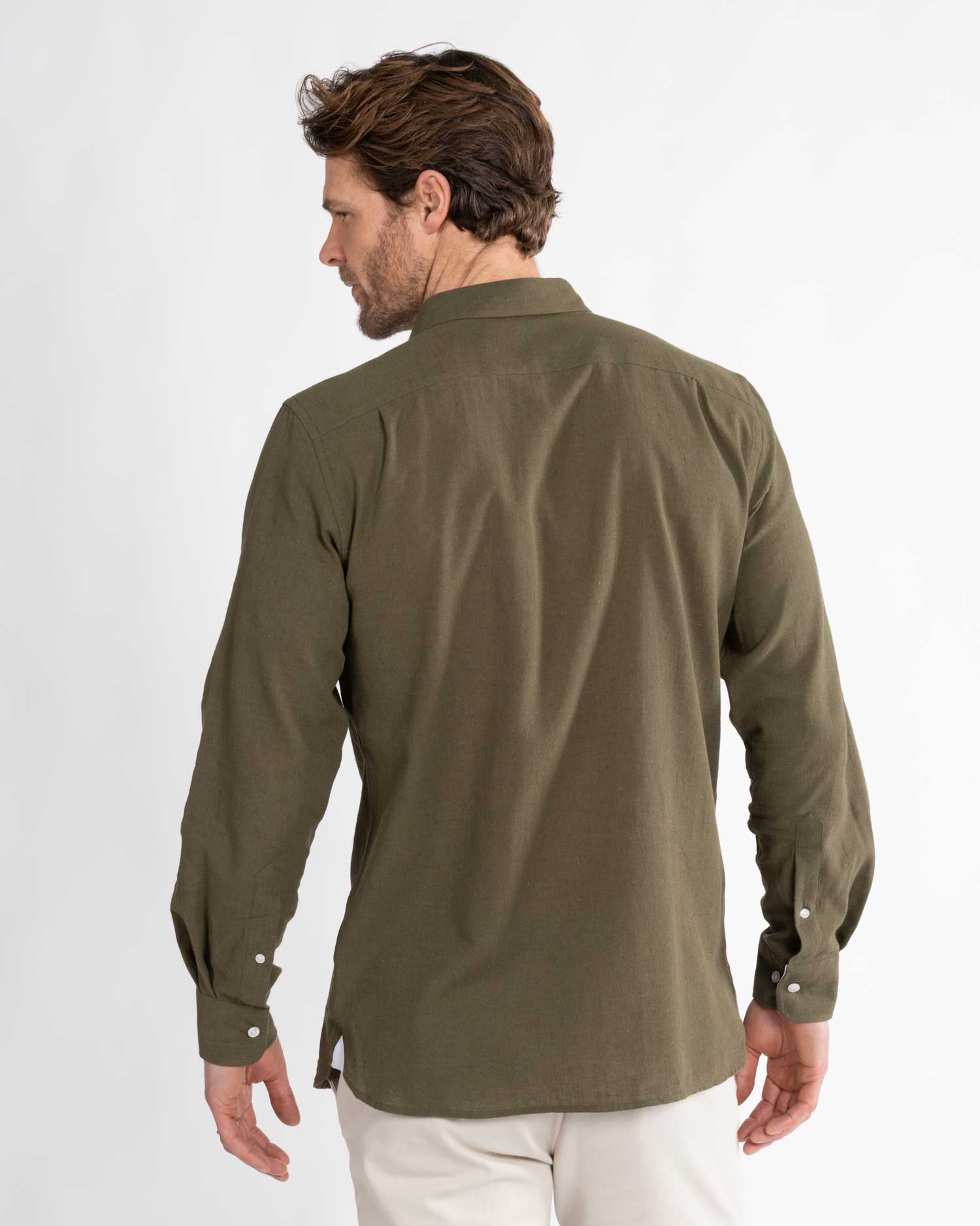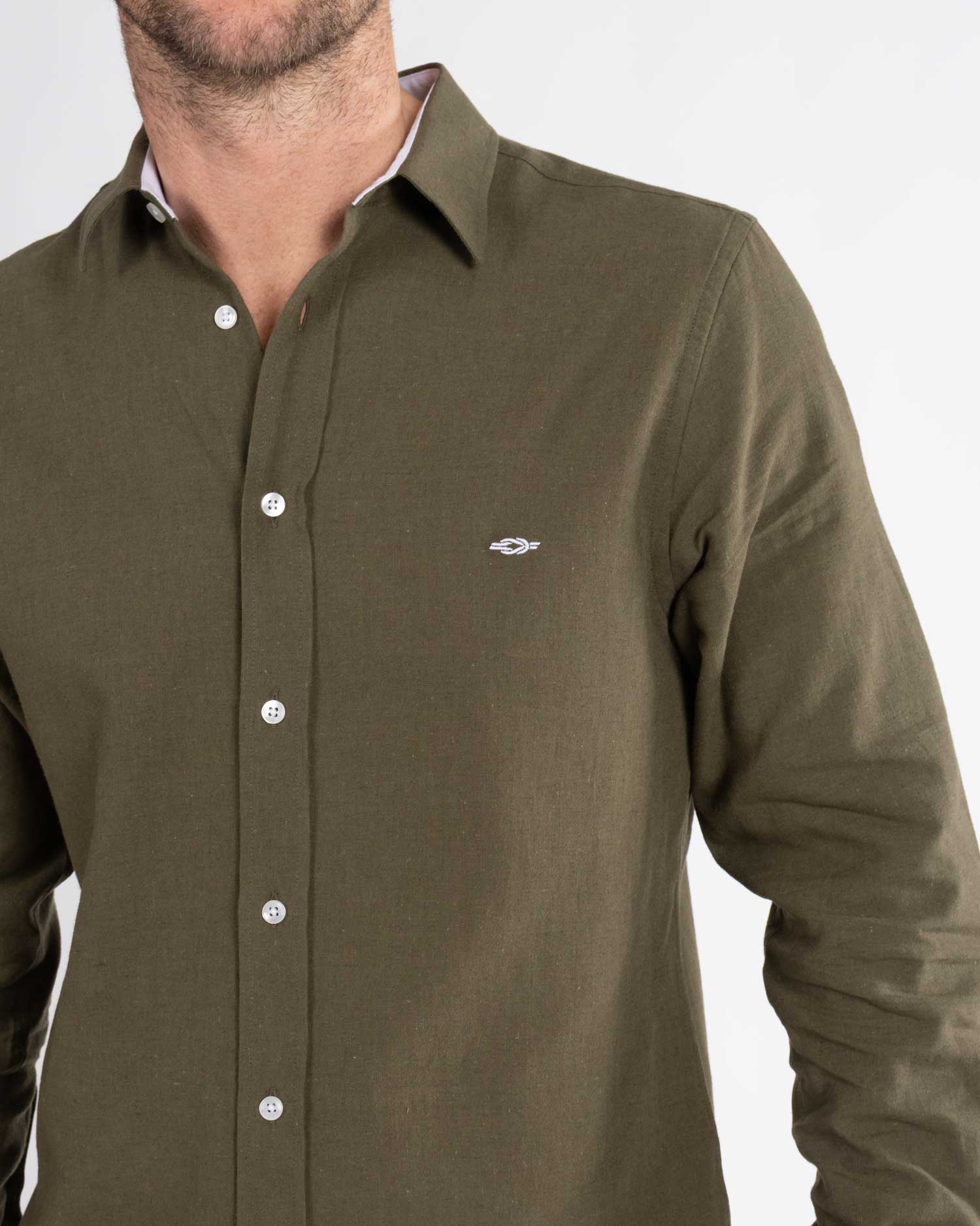 Khaki Green linen shirt by Reef Knots.