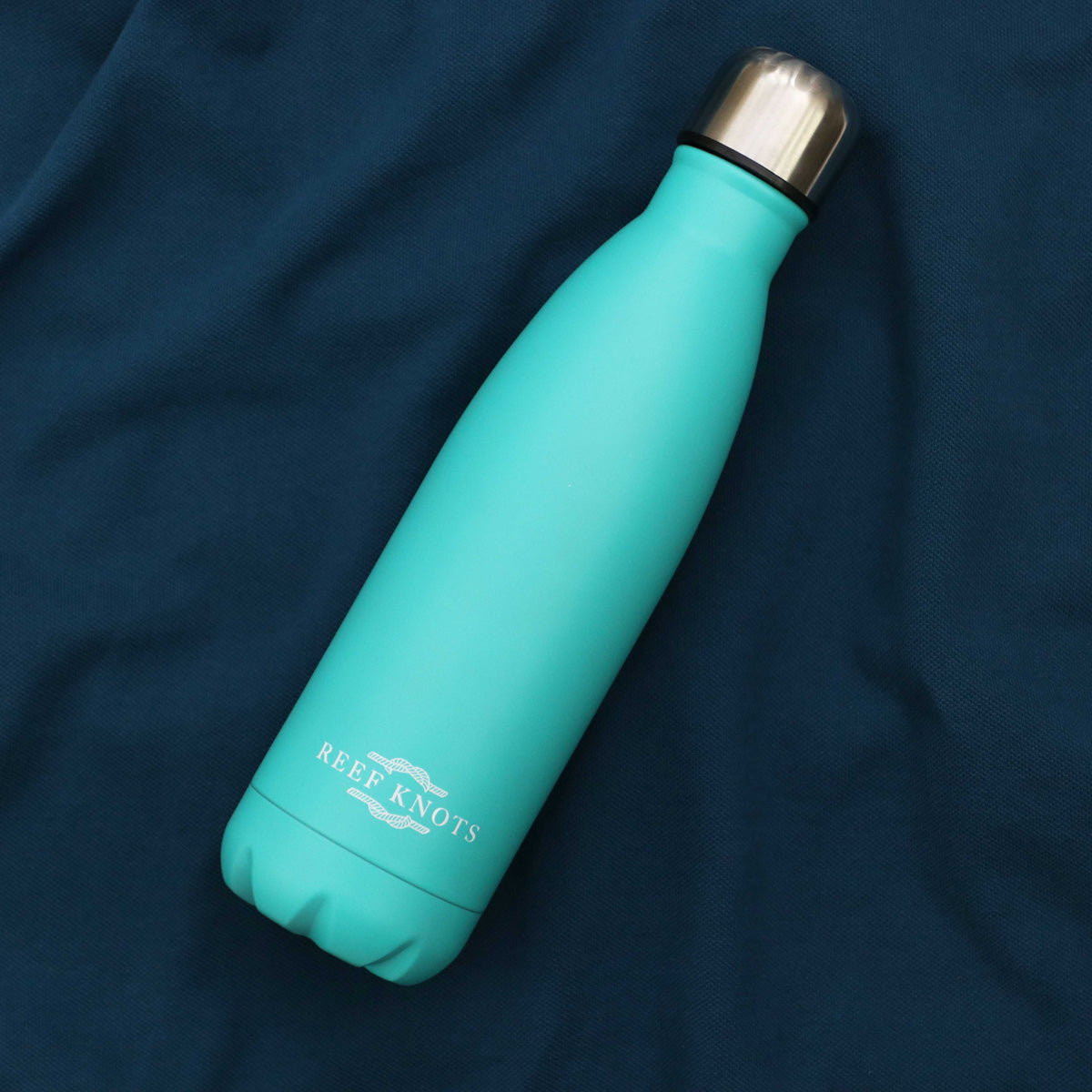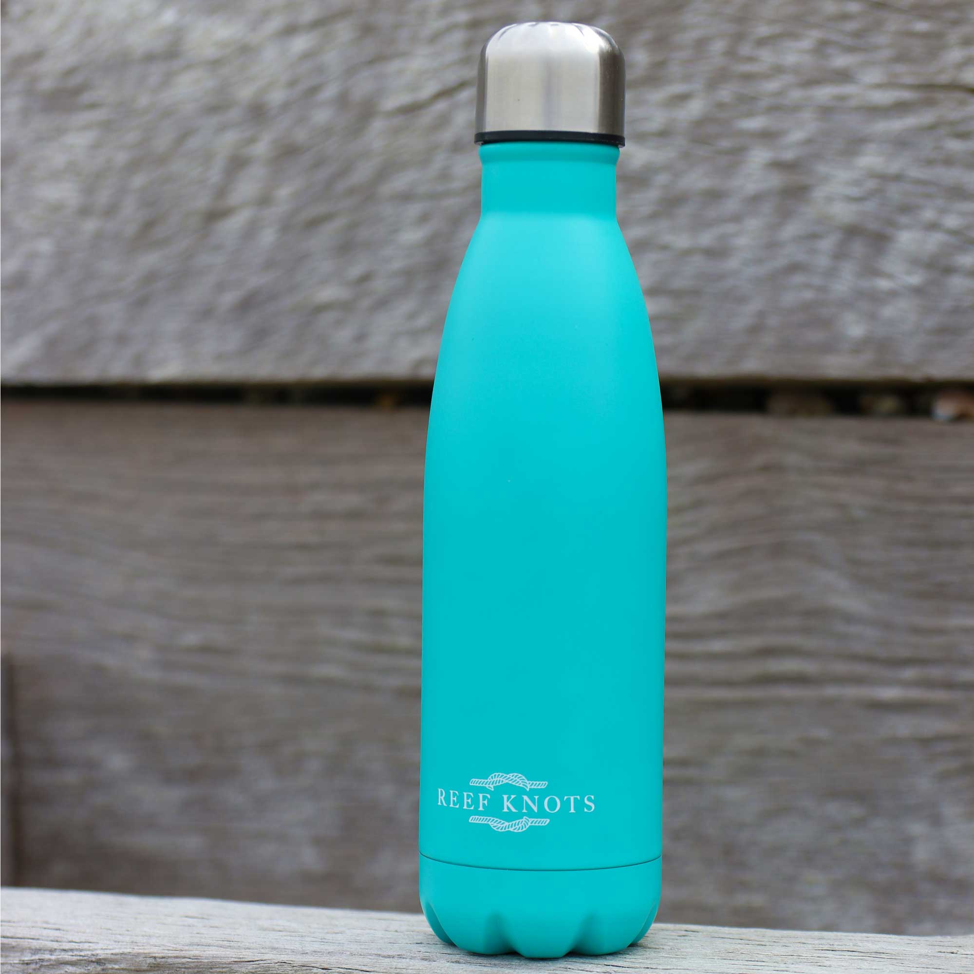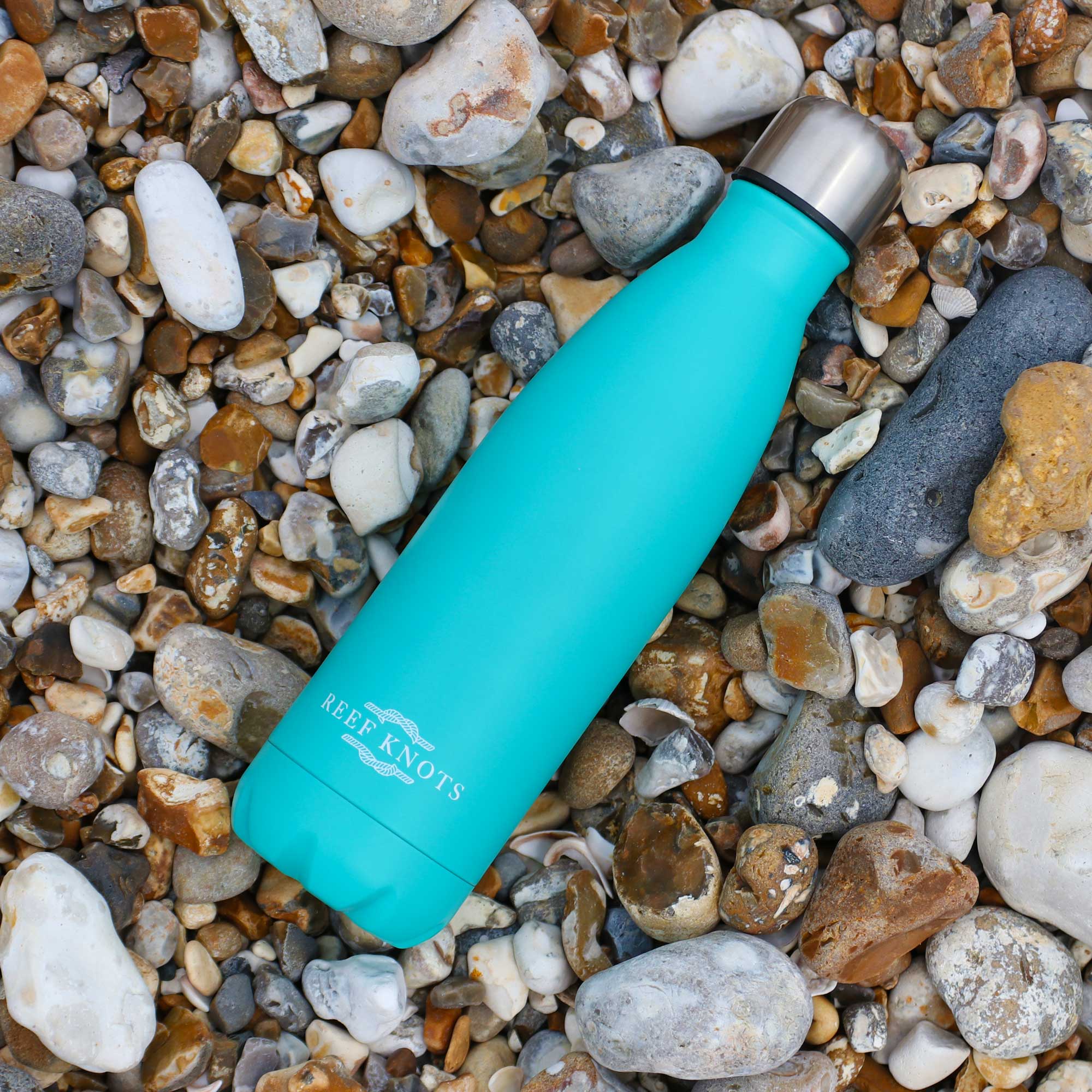 Reusable and insulated aqua coloured 500ml stainless steel water bottle.