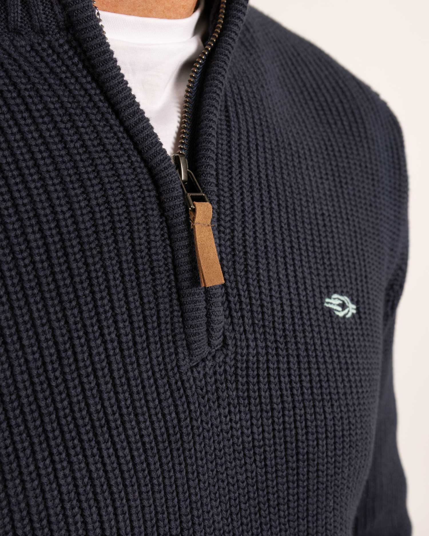 Elevate your cold-weather wardrobe with our Burford chunky knit half zip in Navy. Crafted from a luxuriously soft blend cotton, this thick knitted piece offers warmth and comfort. Featuring a classic ribbed cuffs and hem, the a classic understated piece that has snugness at it's core.