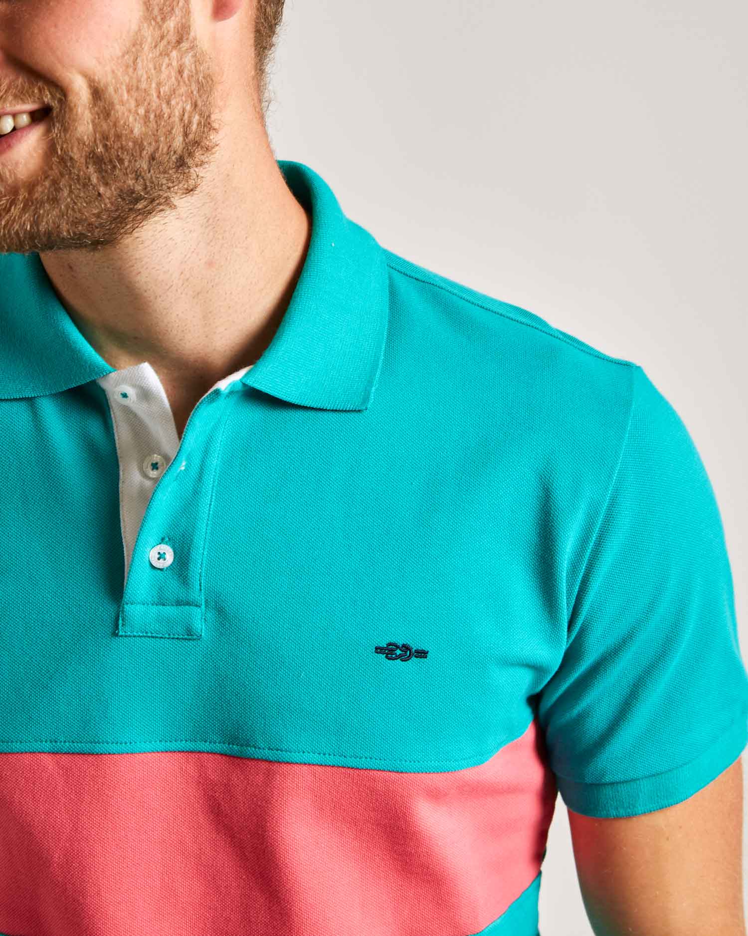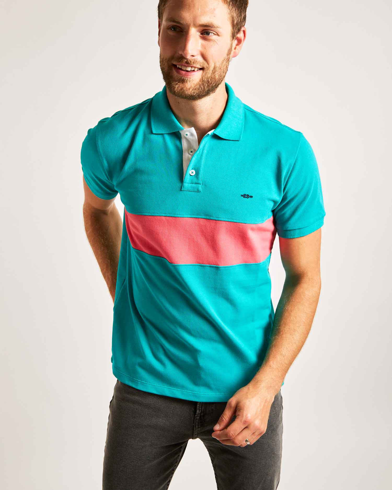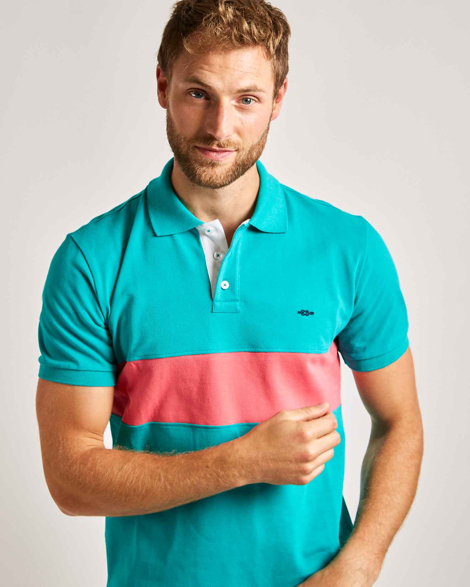 Teal and coral striped polo shirt with white trim. 100% piqué cotton.
