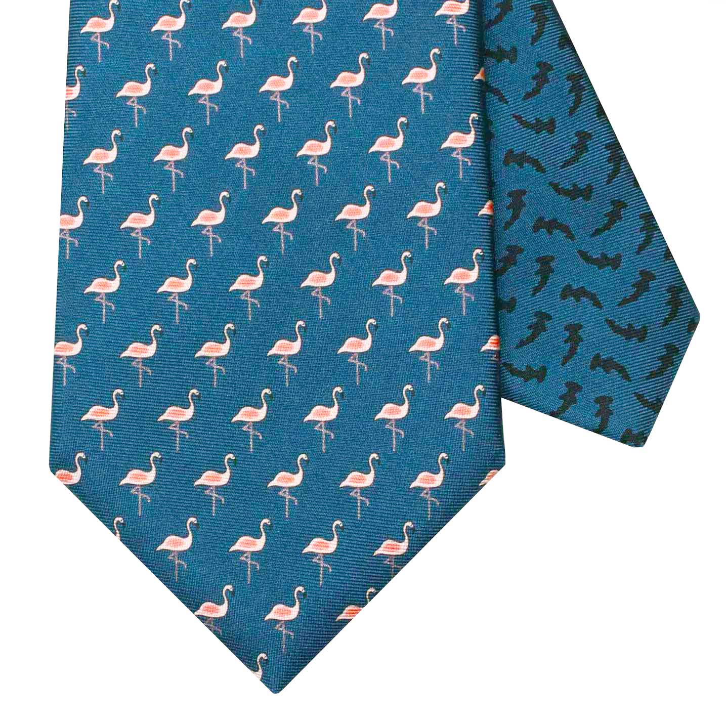Our navy blue flamingo design silk tie is another classic Reef Knots double print with hammerhead sharks circling the tail! The design of this tie was inspired by our first pair of swim shorts and is also the first from our new 'Made in Italy' collection, using some of the finest silk tie craftsmen in the world.