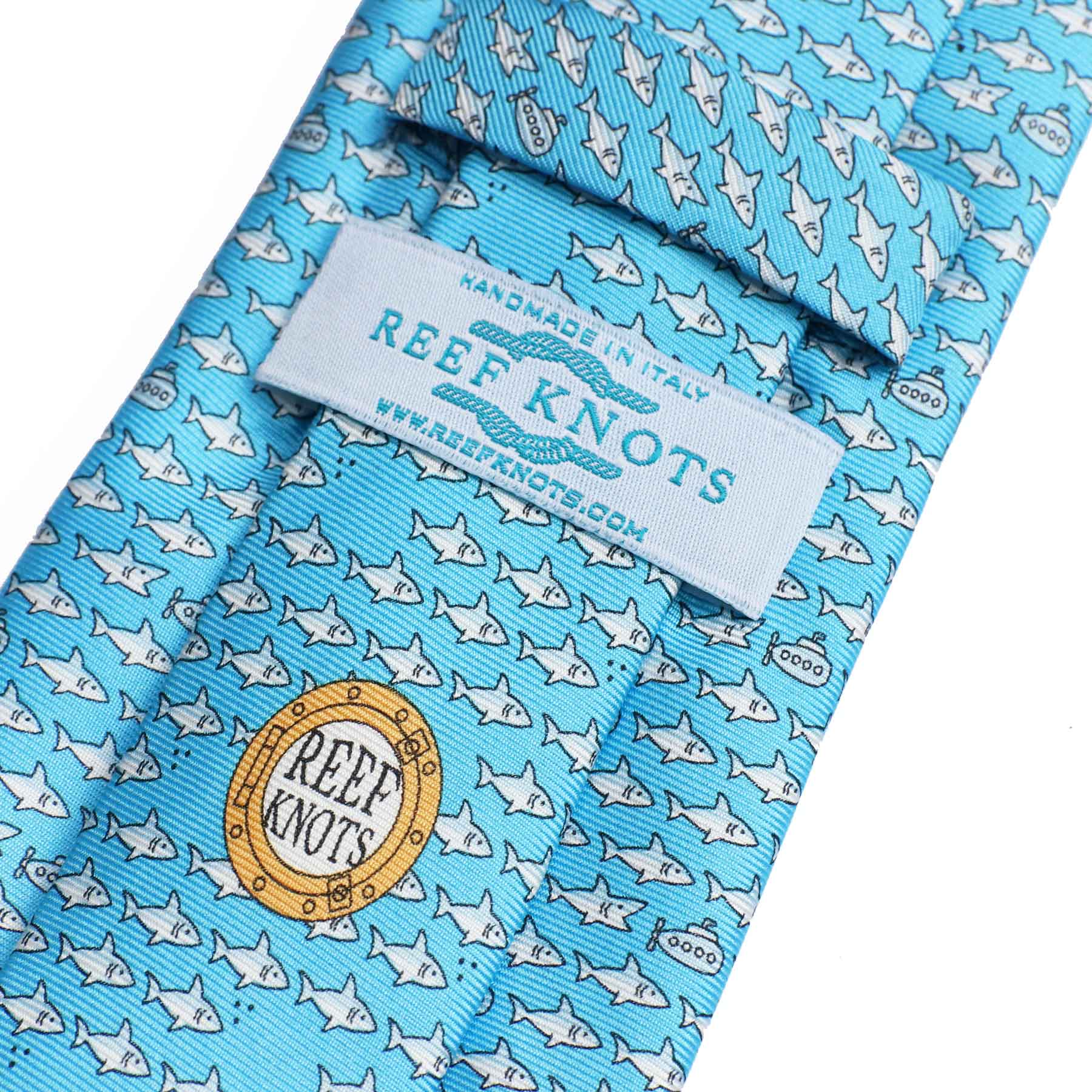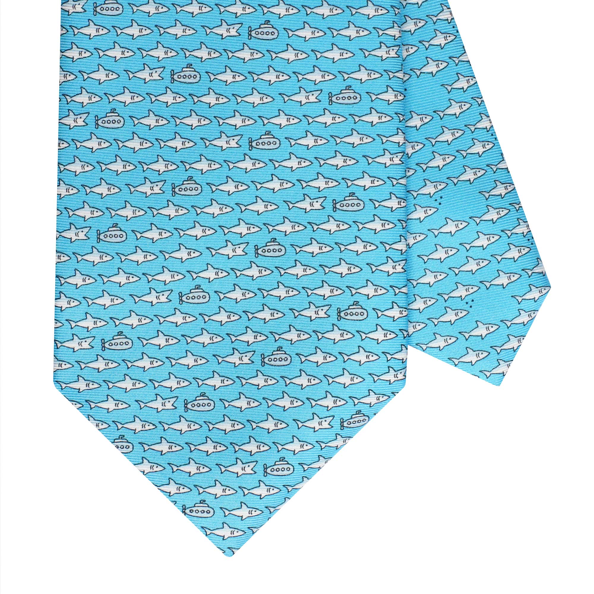 Take a bite out of our shark and submarine silk tie. Featuring a snappy shark and submarine print on the blade and a subtle change on the tail. A smart but characterful design. The perfect tie for all occasions including the office, a set of wedding ties, or a fantastic mens gift.